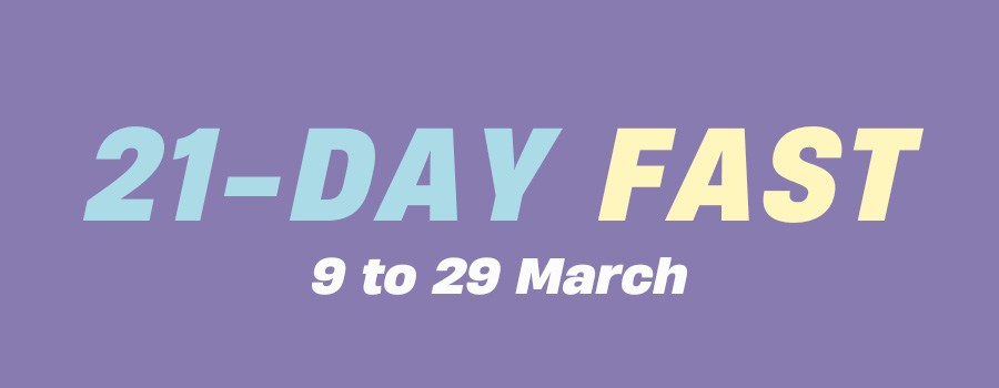 Pause, Pray and Ponder on God's word to prepare our hearts to focus on the incredible sacrifice of Christ's death and to appreciate the salvation we have through his resurrection. If you long for God like the deer pants for water, join us from 9 to 29 March for a 21-days of prayer and fasting. You can register and choose to do a day fast or Daniel fast at evangel.sg/fasting.